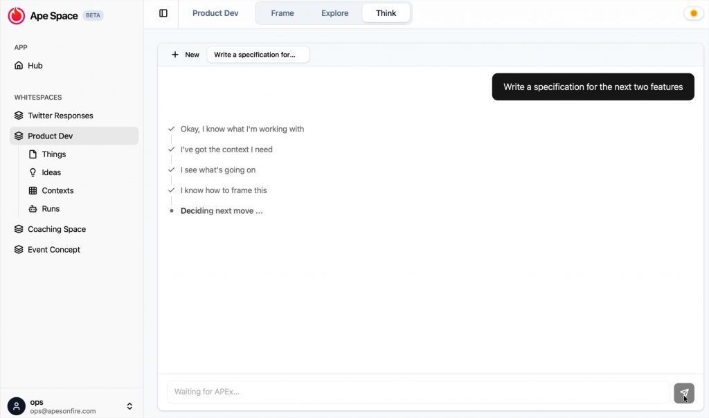All of this builds on the foundations we already laid. Ape Space is not one agent, but the first multi-agentic co-cognitive system we know of that uses a multitude of agents inside a deterministic harness to help people think better.