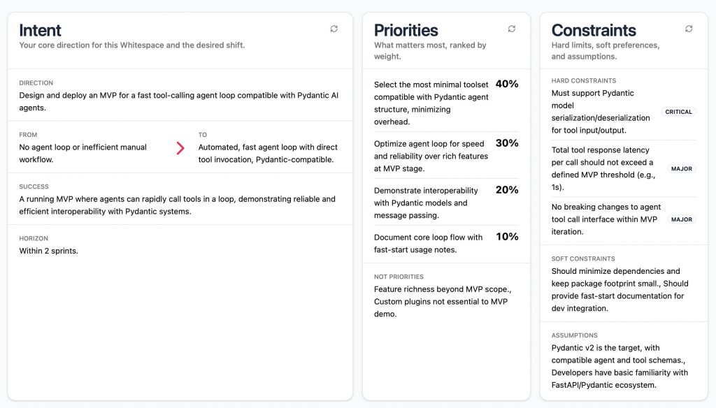 Each whitespace now carries a codified, dynamic model of what it represents: intent, strategy spine, priorities, problem frame, stakeholder map, and the deeper structure of the work itself. It is persistent. It is interactive. And it is accessible to the agents.